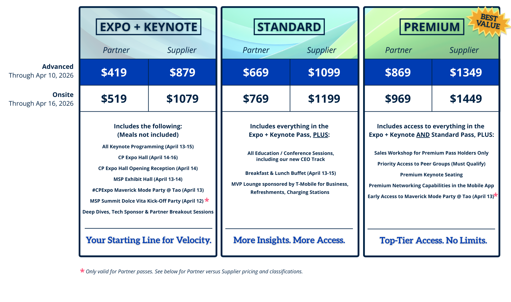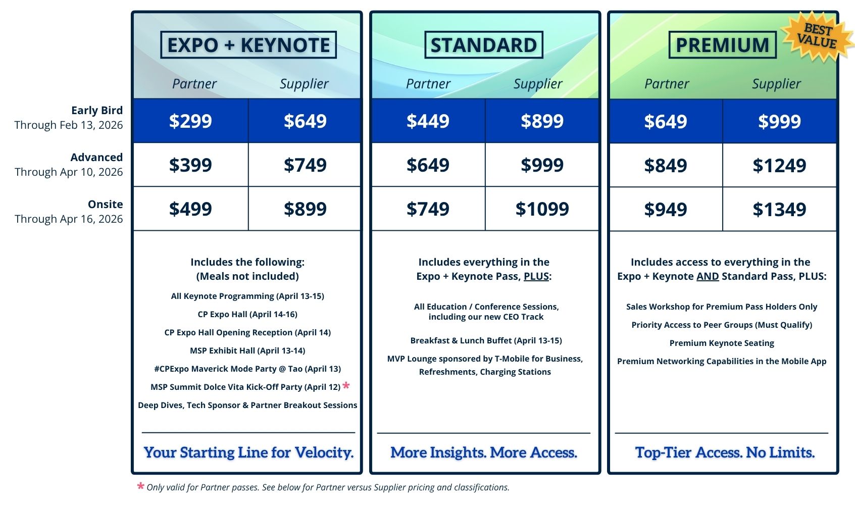 Purchase an Expo + Keynote pass for access to both the Channel Partners and MSP Summit Expo halls, as well as all keynote sessions. Meals are not included with an Expo + Keynote Pass. Standard passes provide access to certain conference sessions and workshops, while Premium passes provide access to the entire event.
