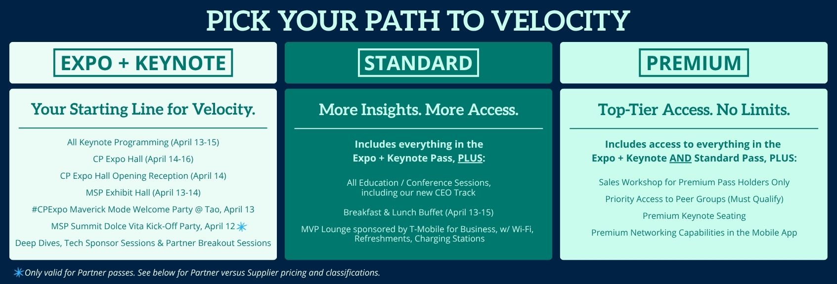 Purchase an Expo + Keynote pass for access to both the Channel Partners and MSP Summit Expo halls, as well as all keynote sessions. Meals are not included with an Expo + Keynote Pass. Standard passes provide access to certain conference sessions and workshops, while Premium passes provide access to the entire event.